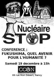 Conférence : Fukushima, quel avenir pour l’humanité ? Date : 19 décembre 2015 Collectif : Anonyme Thématiques : Antinucléaire, Écologies Zone géographique : Nancy Support : Affiche Lieu autogéré : CCAN