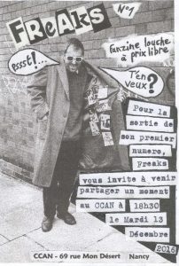 Sortie de Freaks n°1 Date : 13 décembre 2016 Collectif : Autre Thématiques : Contre cultures, Transmission de savoirs - DIY Zone géographique : Nancy Support : Affiche Lieu autogéré : CCAN