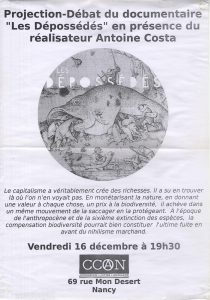 Projection-débat : “Les dépossédés” Date : 16 décembre 2016 Collectif : Autre Thématiques : Aménagement du territoire, Anticapitalisme, Écologies Zone géographique : Nancy Support : Affiche Lieu autogéré : CCAN