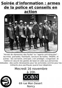 Soirée d’information : armes de la police et conseils en action Date : 16 novembre 2016 Collectif : Anonyme Thématiques : Antirépression, Autogestion, Manifestation, Police, Santé et soins Zone géographique : Nancy Support : Affiche Lieu autogéré : CCAN