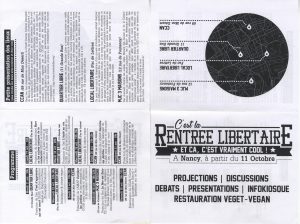 C’est la rentrée libertaire – fly Date : 13 octobre 2016 Collectifs : Autre, CCAN, Nos3Maisons, Quartier Libre Thématiques : Alimentation, Antinucléaire, Bure, Internationalisme, Transmission de savoirs - DIY Zone géographique : Nancy Support : Affiche Lieux autogérés : CCAN, Quartier Libre Autre lieu : MJC des 3 Maisons