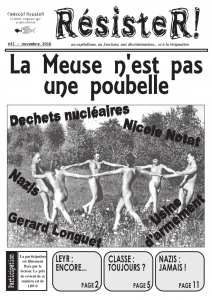 RésisteR #45 – La Meuse n’est pas une poubelle Date : novembre 2016 Collectifs : Nos3Maisons, RésisteR Thématiques : Anticapitalisme, Antifascismes, Critique des médias, Manifestation, Syndicalisme, Vie politique locale Zone géographique : Nancy Support : Journal et fanzine Nom de média : RésisteR