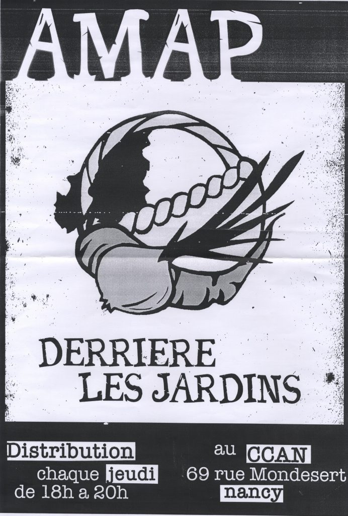 AMAP “Derrière les jardins” Date : Non définie Collectif : Autre Thématiques : Agricultures, Alimentation, Autogestion, Cantine - Bouffe Zone géographique : Nancy Support : Affiche Lieu autogéré : CCAN