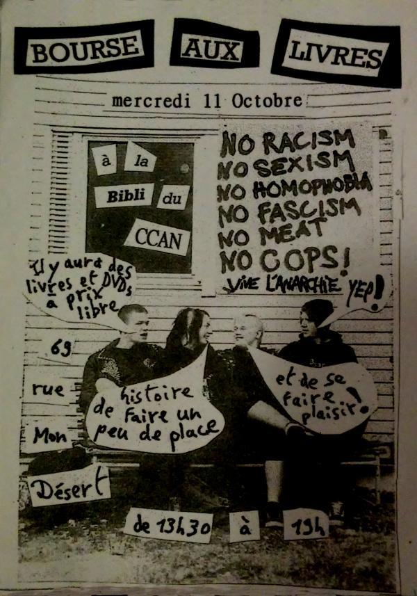 Bourse aux livres à la bibli du CCAN Date : 11 octobre 2017 Collectif : CCAN Thématiques : Anticapitalisme, Autogestion, Contre cultures, Transmission de savoirs - DIY Zone géographique : Nancy Support : Affiche Lieu autogéré : CCAN