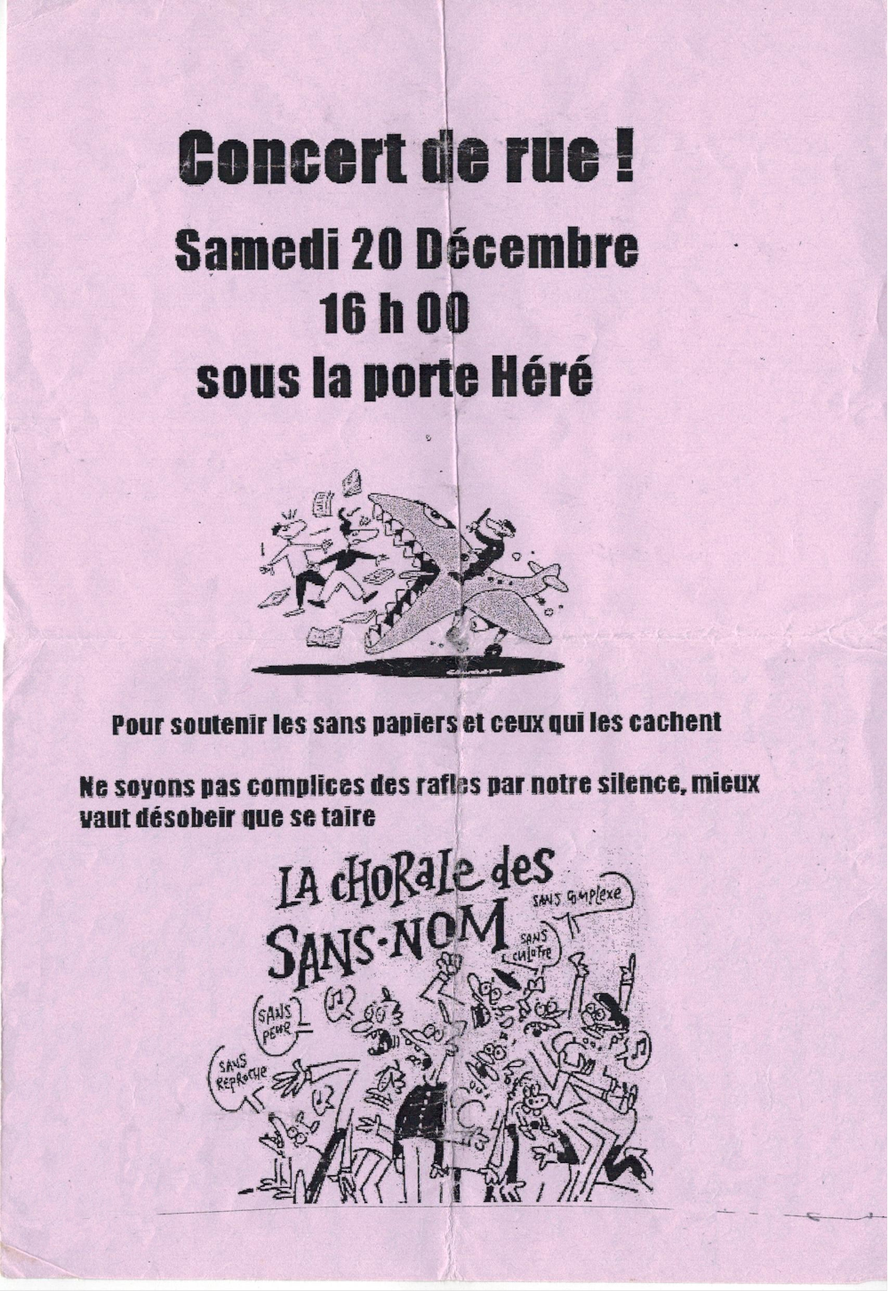 Concert de rue ! Date : 20 décembre 2008 Collectif : La chorale des Sans-Nom Thématique : Migrations Zone géographique : Nancy Support : Tract