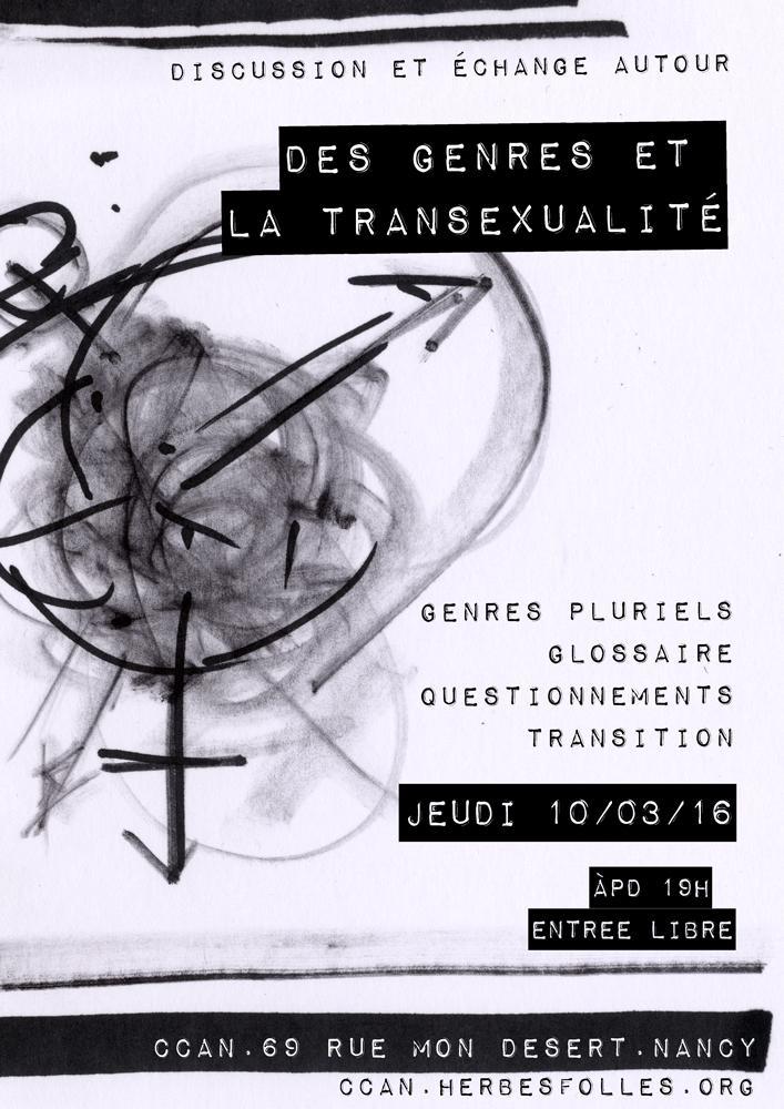 Discussion et échange autour des genres Date : 10 mars 2016 Collectif : Anonyme Thématique : Transidentités Zone géographique : Nancy Support : Affiche Lieu autogéré : CCAN
