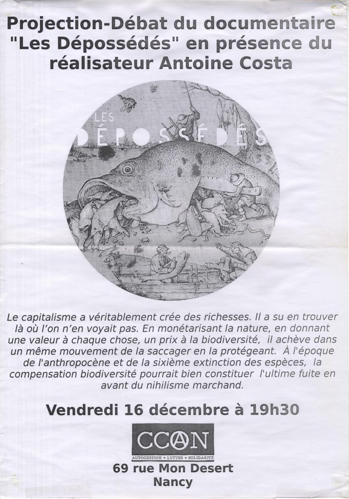 Projection-débat : “Les dépossédés” Date : 16 décembre 2016 Collectif : Autre Thématiques : Aménagement du territoire, Anticapitalisme, Écologies Zone géographique : Nancy Support : Affiche Lieu autogéré : CCAN