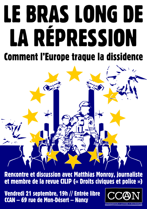Rencontre et discussion : le bras long de la répression Date : 21 septembre 2018 Collectif : Anonyme Thématiques : Antimilitarisme, Antirépression, Police, Surveillance Zone géographique : Nancy Support : Affiche Lieu autogéré : CCAN