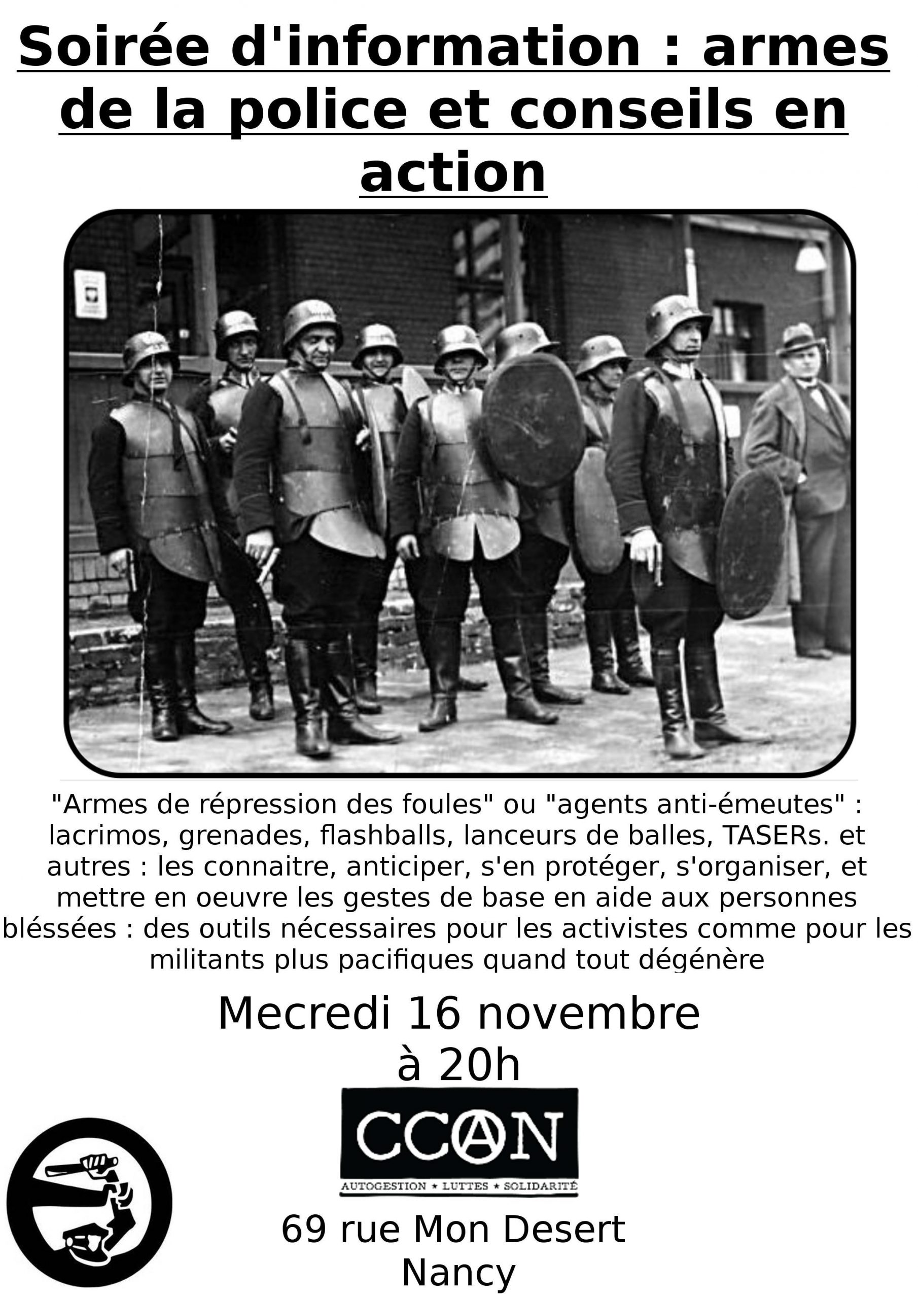 Soirée d’information : armes de la police et conseils en action Date : 16 novembre 2016 Collectif : Anonyme Thématiques : Antirépression, Autogestion, Manifestation, Police, Santé et soins Zone géographique : Nancy Support : Affiche Lieu autogéré : CCAN