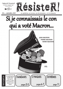 RésisteR #51 – Si je connaissais le con qui a voté Macron… Date : septembre 2017 Collectif : RésisteR Thématiques : Antifascismes, Santé et soins, Travail, Vie politique locale Zone géographique : Nancy Support : Journal et fanzine Nom de média : RésisteR