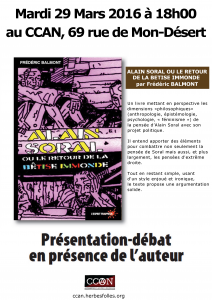 Présentation du livre “Alain Soral ou le retour de la bêtise immonde” Date : 29 mars 2016 Collectif : Anonyme Thématique : Antifascismes Zone géographique : Nancy Support : Affiche Lieu autogéré : CCAN