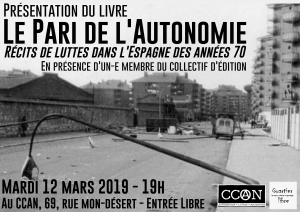 Présentation du livre : Le pari de l’autonomie Date : 12 mars 2019 Collectifs : CCAN, Quartier Libre Thématiques : Actions directes, Antirépression, Autogestion, Internationalisme, Mouvements sociaux, Prison, Travail Zone géographique : Nancy Support : Affiche Lieu autogéré : CCAN
