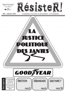 RésisteR #40 – La justice politique des jantes Date : janvier 2016 Collectif : RésisteR Thématiques : Anarchie, Antifascismes, Antirépression, Élections, Justice, Migrations, Prison, Surveillance, Syndicalisme, Vie politique locale Zone géographique : Nancy Support : Journal et fanzine Nom de média : RésisteR