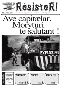 RésisteR #35 – Ave capitaelar, Moryturi te salutant ! Date : avril 2015 Collectif : RésisteR Thématiques : Anticapitalisme, Anticolonialisme, Antimilitarisme, Antinucléaire, Autogestion, Bure, Chômage, Écologies, Féminismes - Antipatriarcat, Migrations, Vie politique locale Zone géographique : Nancy Support : Journal et fanzine Nom de média : RésisteR