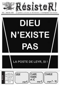 RésisteR #33 – Dieu n’existe pas, la poste de Leyr, si ! Date : janvier 2015 Collectif : RésisteR Thématiques : Antifascismes, Antiracismes, Critique des médias, Internationalisme, Justice, Mouvements sociaux, Prison, Religions, Syndicalisme, Vie politique locale Zone géographique : Nancy Support : Journal et fanzine Nom de média : RésisteR