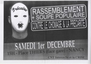 Rassemblement contre le chômage et la précarité Date : 1 décembre 2012 Collectifs : CNT, La C.R.I.S.E. Thématiques : Chômage, RMI - RSA Zone géographique : Nancy Support : Affiche